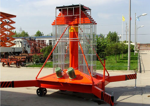 02 套缸升降機整機由平臺、伸縮油缸、單梯式或雙梯式防轉(zhuǎn)機構(gòu)、底盤油箱、支腿、行走輪等組成。